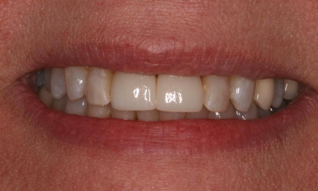 Old porcelain crowns that had chipped and were replaced with new crowns.