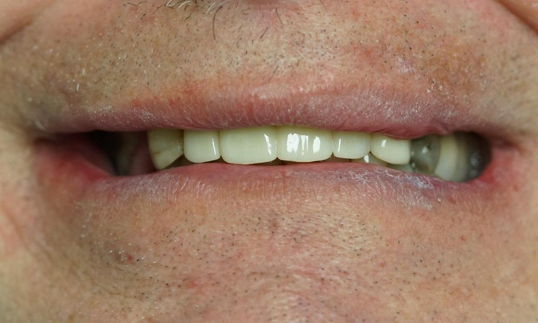 This patient had a bridge in the front over natural teeth which wore out and had to be removed. It was replaced with implants and a new bridge over the implants.
